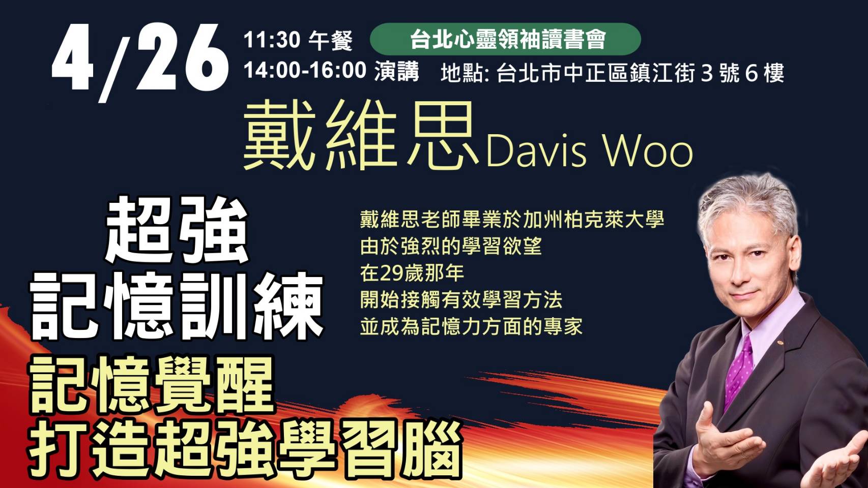 The Taipei Leadership Book Club is honored to invite memory training expert Davis Woo to deliver a special seminar on “Powerful Memory Training.”