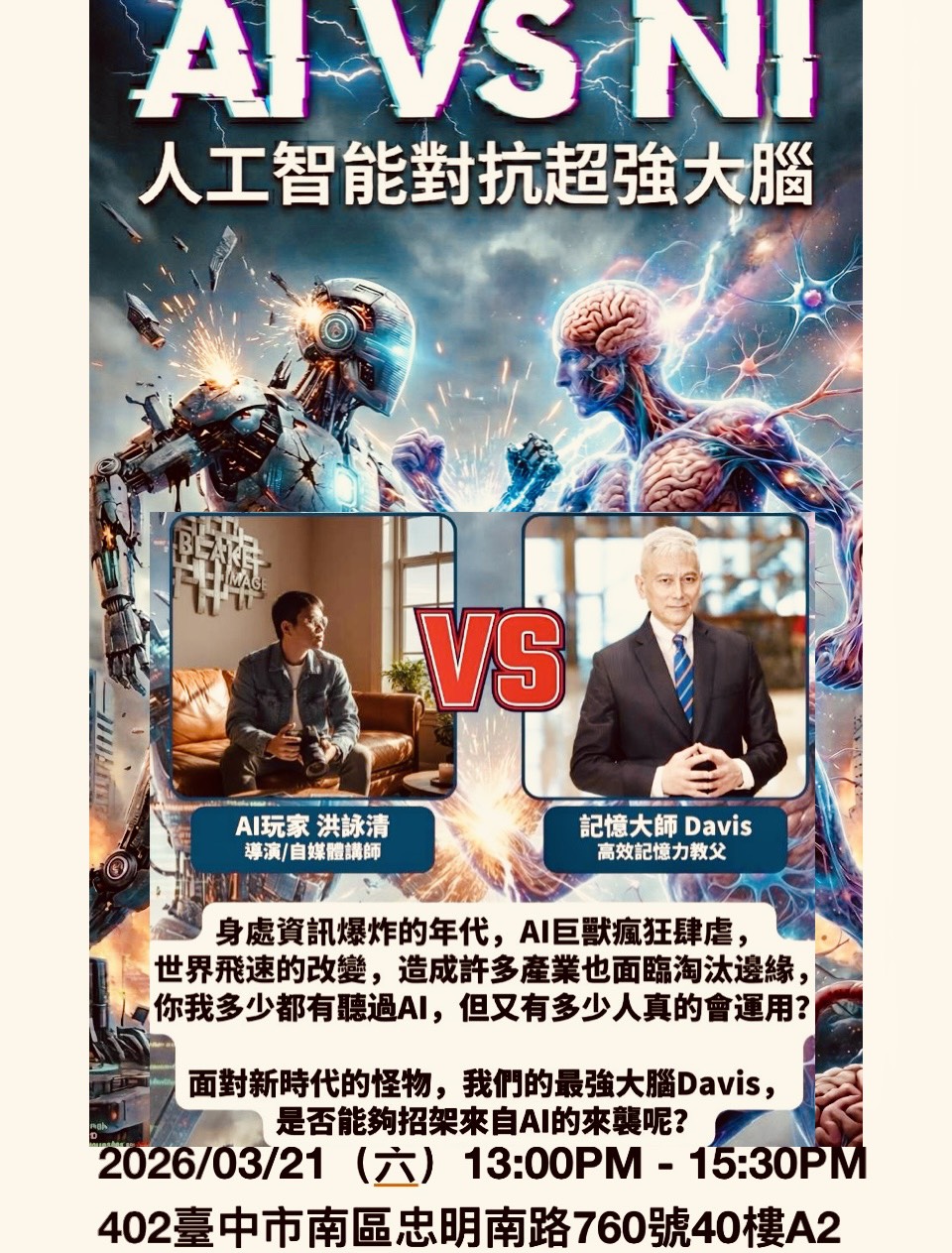 本次講座邀請到高效記憶力教父 Davis 與 自媒體講師洪詠清,帶您深入探討在 AI 時代,人類大腦如何與科技協作,並在競爭激烈的市場中脫穎而出。