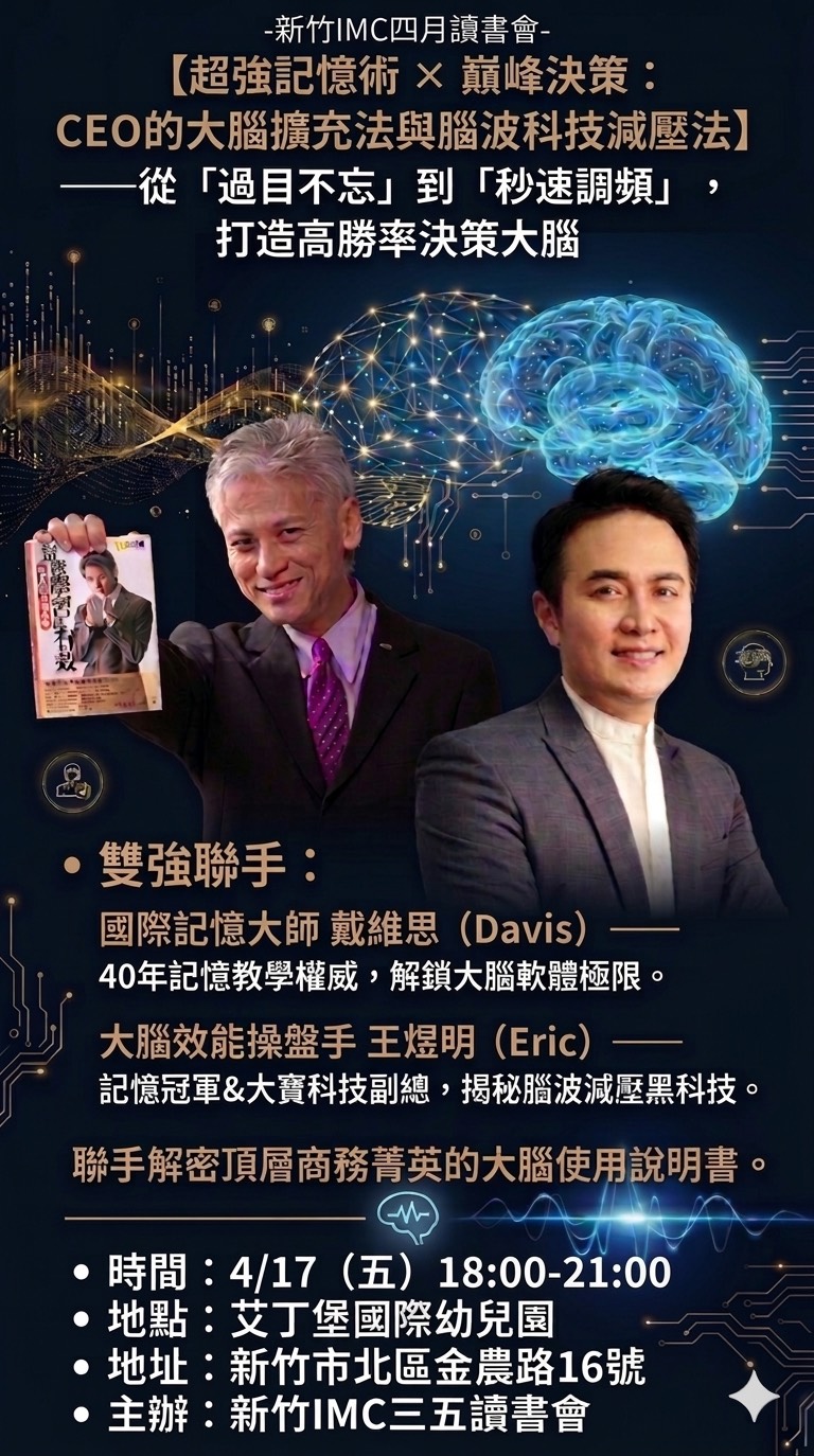 In a high-stakes business world, the quality of your decisions depends on your brain’s processing power. The Hsinchu IMC April Book Club is proud to present a unique collaboration that reveals the "Brain User Manual" of top-tier elites.