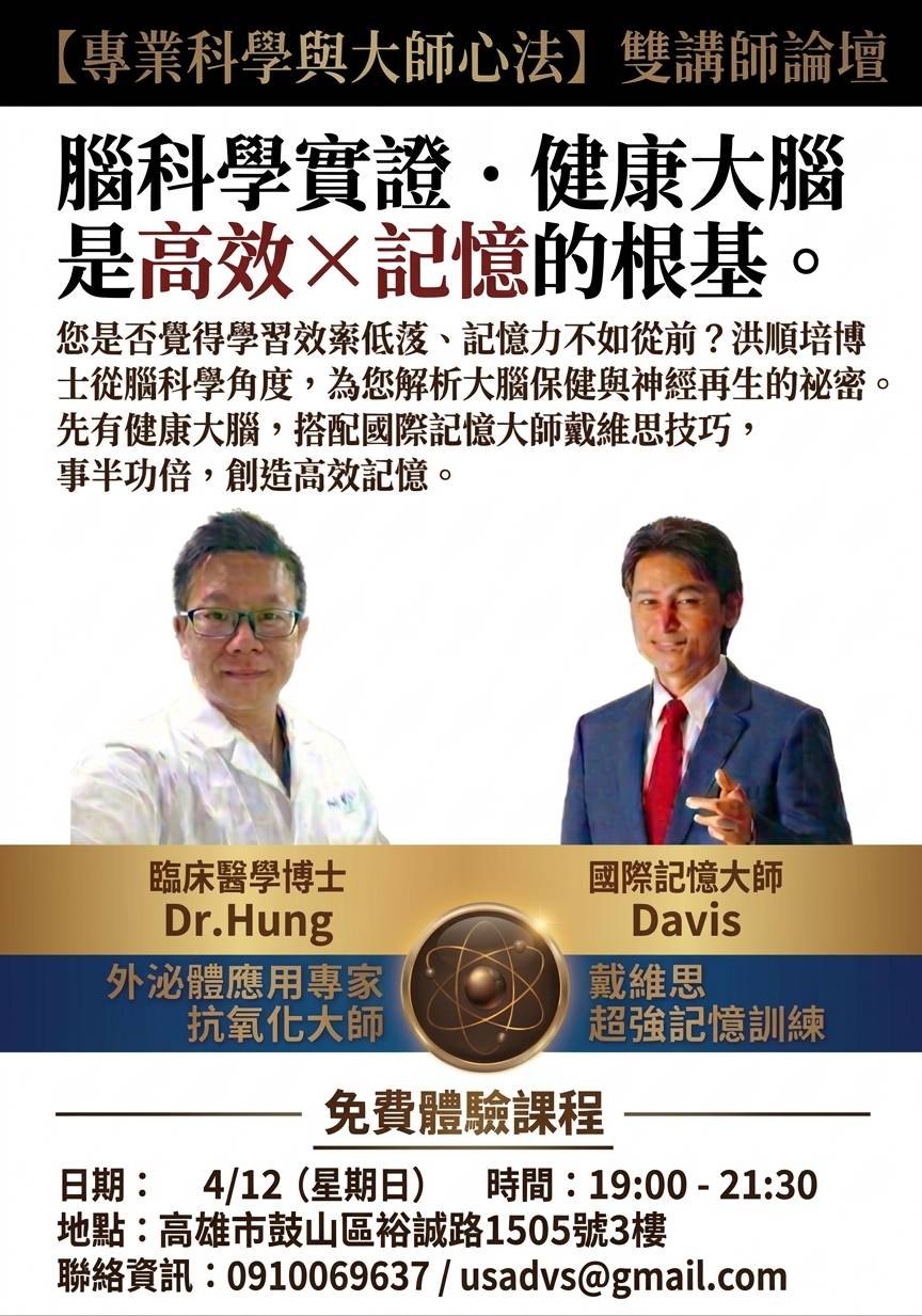 This forum features Dr. Hung, a Clinical Medicine Ph.D. and expert in neuroregeneration, alongside International Memory Master Davis Woo. Together, they will decode the secrets of brain maintenance and demonstrate how to build a high-efficiency memory system by first ensuring a healthy neurological foundation.