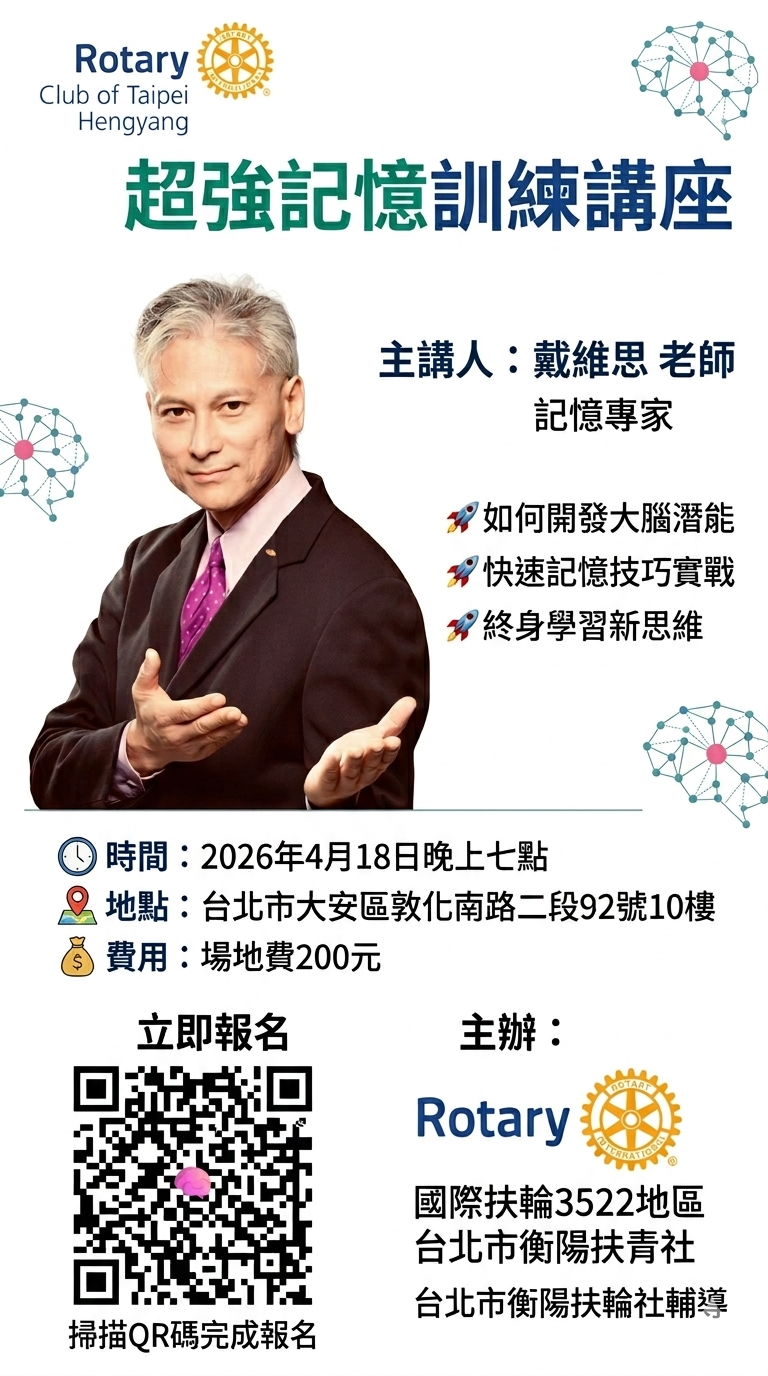 In an era of information overload, learning how to learn efficiently is a crucial skill for success. The Rotaract Club of Taipei Hengyang is honored to invite world-renowned memory expert, Mr. Davis Woo, to share his proven techniques for brain development and rapid memorization.