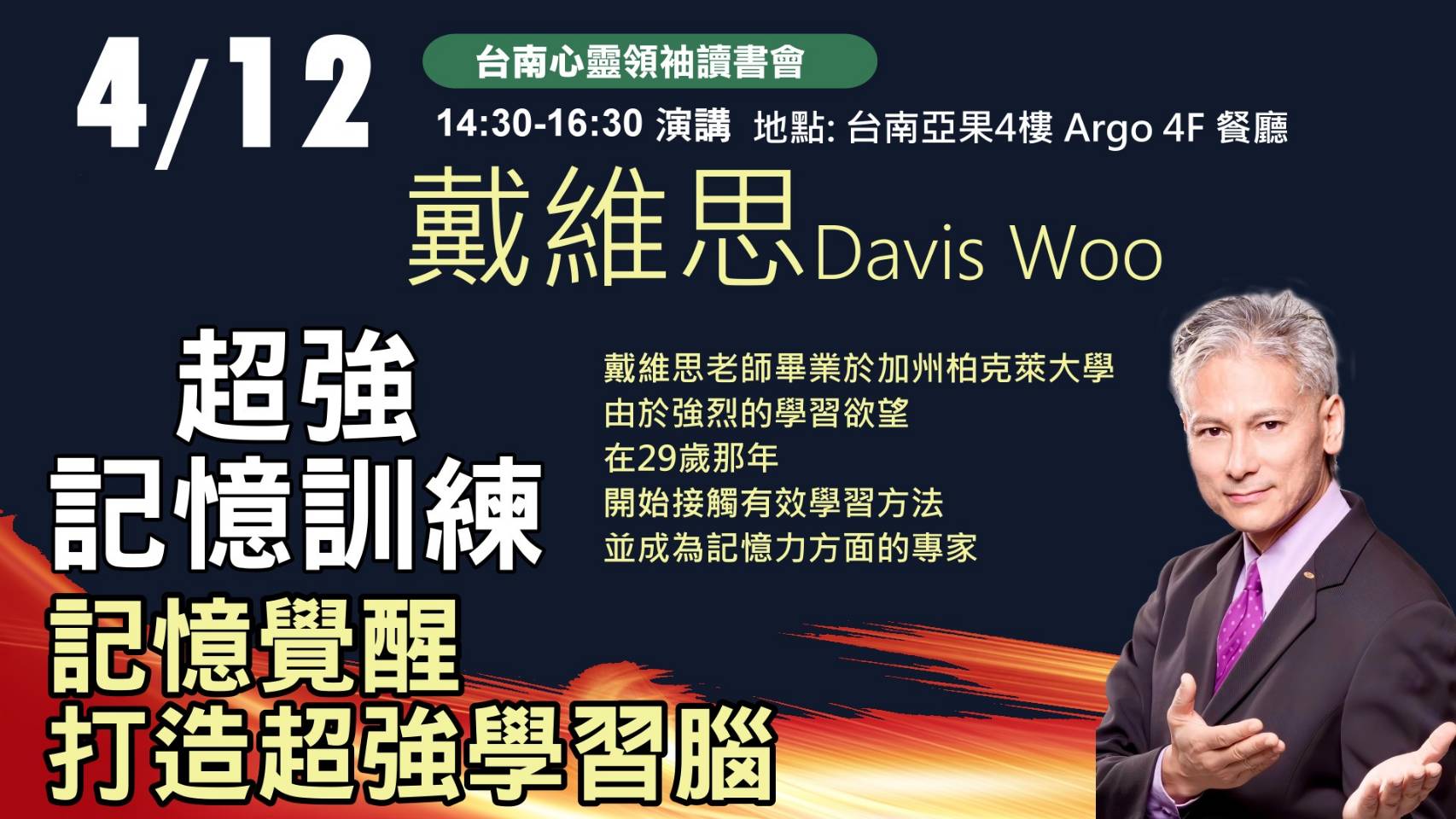 Do you want to enhance your learning efficiency and develop a sharper focus? The Tainan Spiritual Leaders Reading Club is proud to present a special seminar featuring memory expert Davis Woo. A graduate of UC Berkeley, Davis Woo dedicated himself to mastering effective learning methods at age 29 and has since become a leading specialist in memory enhancement. Join us to unlock your brain's potential and build a high-performance "learning brain."