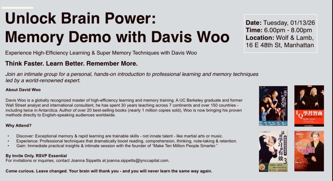 思考更快、學習更好、記憶更多。 誠摯邀請您參加一場私密的實作演示會,由世界知名的學習與記憶大師 Davis Woo 親自主講。